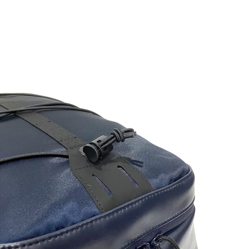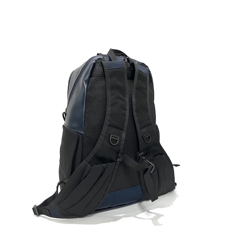 今回はメインライン「White Mountaineering」とのコラボリリースです。コラボレーション仕様としてセレクトした合成皮革とナイロンのコンビネーションを採用。異なる素材のコントラストが洗練されたフォルムに奥行きをプラス。軽アウターや手袋などを留めるバンジーコードを前胴に配置したBRIEFING デイパック。各所にメッシュ素材を採用し、軽量性と通気性を重視しています。ショルダーストラップにはスマートフォンなどの身の回りのものを入れるのに便利なポケットを完備。伸縮性のメッシュ素材を使用し、中に入れたものが飛び出しにくい構造です。