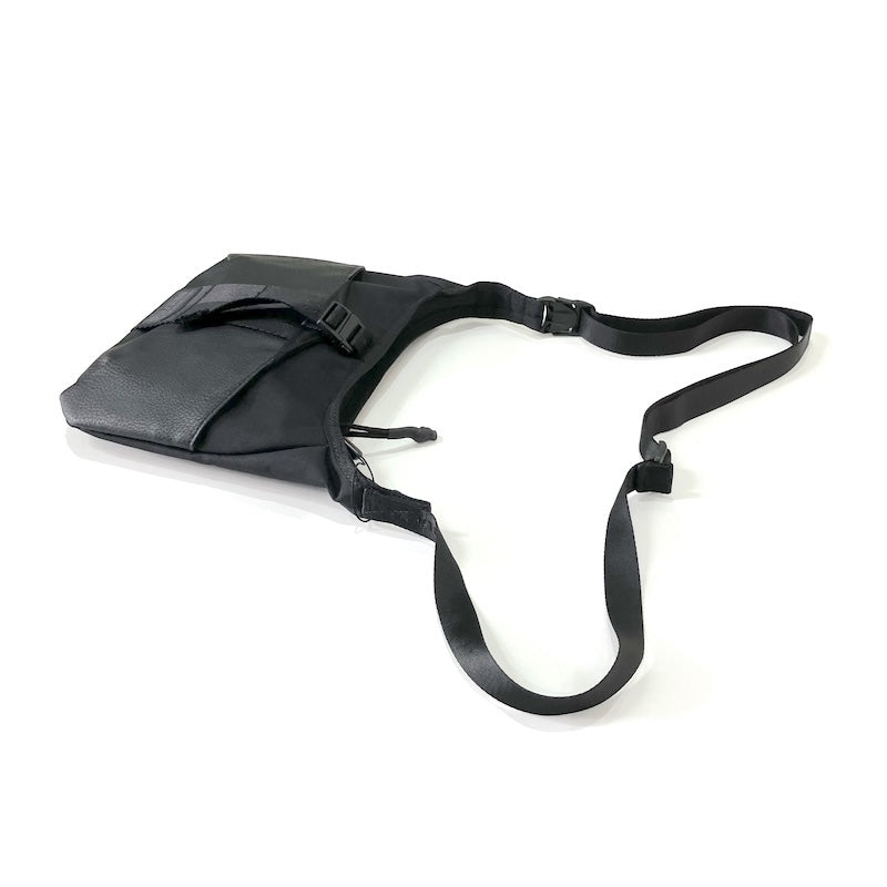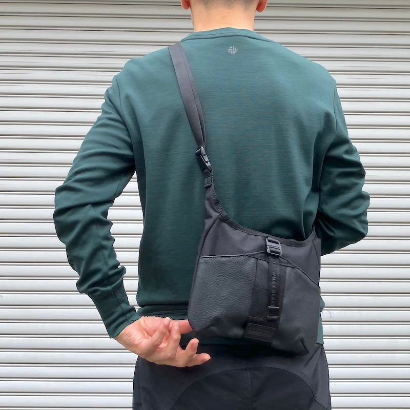 スマートなフォルムが特徴のサコッシュです。コンパクトなサイズながらも内装背面側とフロントにポケットを配しているため仕分け収納が可能。マチを薄くすることで体にフィットしやすく、アウターの下などに持っても嵩張りません。